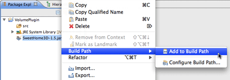 The development of a plug-in is based on some classes of Sweet Home 3D that Eclipse must know to be able to build your project. The easiest way to add Sweet Home 3D classes to Eclipse is to download the JAR executable version of Sweet Home 3D available at https://sourceforge.net/projects/sweethome3d/files/SweetHome3D/SweetHome3D-7.5/SweetHome3D-7.5.jar/download. Once downloaded, drag and drop the file SweetHome3D-7.5.jar on the VolumePlugin project icon in the Package Explorer view of Eclipse, and choose the item Build Path > Add to Build Path in the contextual menu of SweetHome3D-7.5.jar file, as shown in figure 2.
