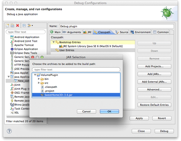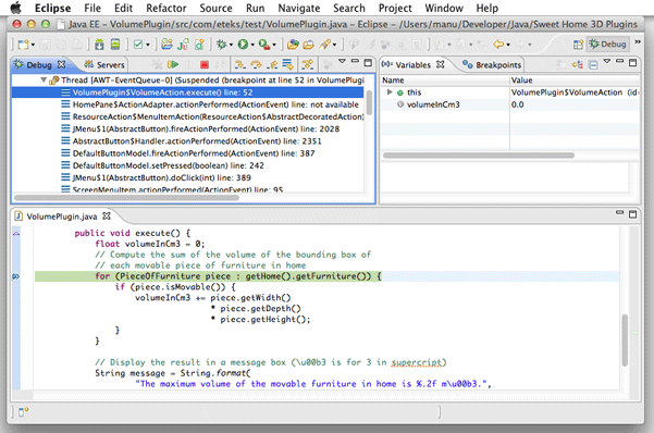 - Finally, click on the Debug button to launch Sweet Home 3D in debug mode. Once the program is running, open the VolumePlugin.java file, set a breakpoint in the execute method and choose Tools > Compute volume from Sweet Home 3D menu. Eclipse will stop on the selected breakpoint to let you execute the program step by step and inspect variables value.
