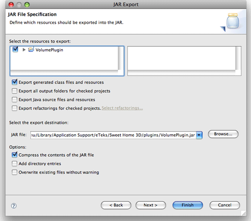 The plug-in JAR contains the class files created from the compilation of the VolumePlugin.java file, and the ApplicationPlugin.properties file. As Eclipse compiles a Java file as soon as you save it, you just have to choose File > Export… from the menu and select Java > JAR file in the Export dialog that will be displayed. In the Jar Export wizard that appears as shown in figure 6, select the project check box and enter the path of a JAR file placed in the Sweet Home 3D plug-ins folder. This appropriate folder depends on your system as follows: