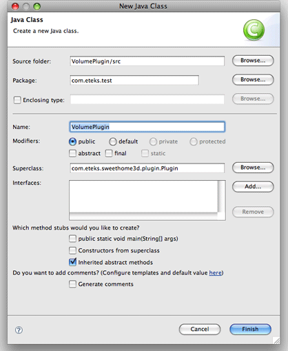 In the New Java Class dialog, enter VolumePlugin as the class name, enter a package (here the chosen package was com.eteks.test), and choose com.eteks.sweethome3d.plugin.Plugin as the super class of VolumePlugin. Once done, click on Finish. Eclipse will create the file of the new class with the following content: