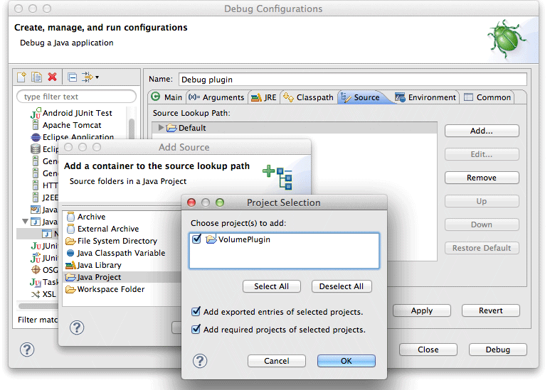 - Select the Source tab, click on the Add… button, double click on the Java Project item in the Add Source dialog box, select the VolumePlugin item in the Project Selection popup and confirm your choice.